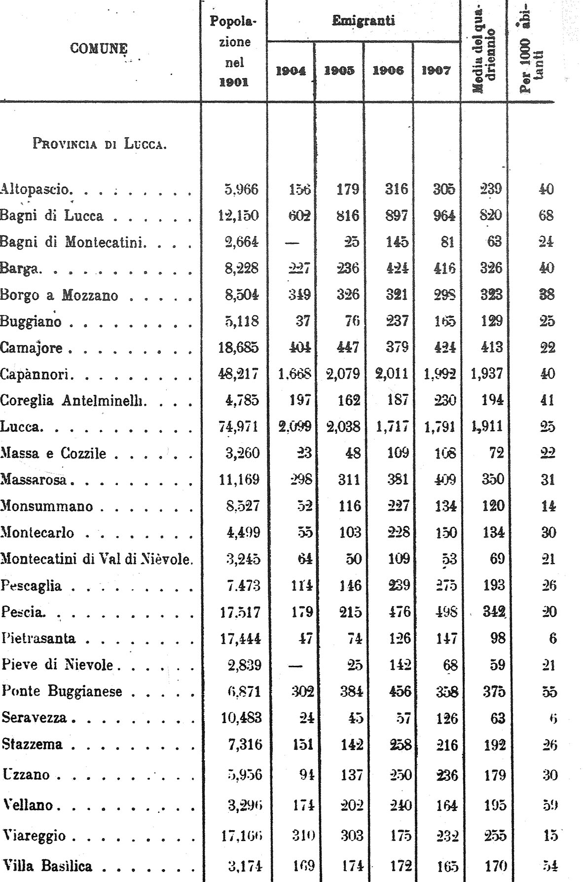 Statistica degli anni 1904/05/06/07 relativa all'emigrazione nella Provincia di Lucca.