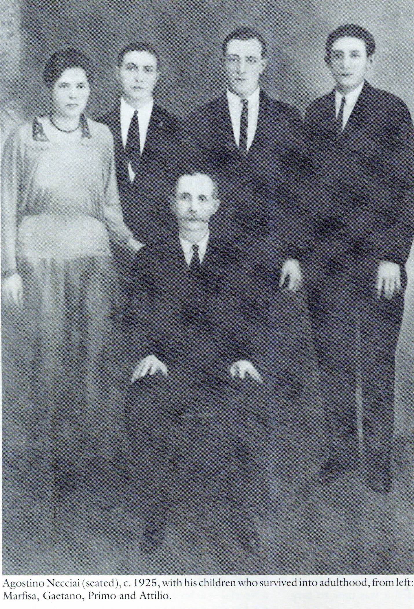 Il mio nome è Terry Necciai, ho studiato Italiano all’Università (Carnegie-Mellon University) nel 1976 and 1977, ma non ricordo abbastanza per scrivere e leggere italiano bene. Ho sempre voluto sapere della famiglia Necciai. Ci sono molti Necciai a Monongahela, ma da nessun'altra parte in America (tranne alcune piccole famiglie che si sono trasferite da qui). I Necciai qui non parlano molto. I vecchi sono morti con molti segreti. Da parte di mia madre (inglese, tedesco, ecc.) I miei parenti raccontano tutto e si riuniscono per le grandi riunioni. Tutto ciò che ho saputo dei Necciai è questo: Agostino Necciai era un bruciatore di carbone (carbonaio?). Sposò Armida Damiani intorno al 1885. Dicono che era ricca e la sua famiglia non accettò il matrimonio. Agostino era autodidatta e sapeva leggere tutti i classici italiani e latini. Ha scritto poesie molto eleganti in italiano. Quando morì, in America, i suoi figli distrussero i suoi libri di poesie. Mi piacerebbe sapere se ce ne sono altri. Il poema che ho è una storia satirica che protesta contro i Savoiardi e la Chiesa Cattolica per aver voluto che la gente andasse in guerra. Agostino odiava la Chiesa Cattolica, per qualche ragione, così tanto che i suoi figli e nipoti non sarebbero nemmeno entrati in chiesa, anche in momenti speciali come matrimoni, battesimi e figli. Agostino e Armida hanno avuto tre figli in Italia, ma due (dicono) sono morti da bambini. Nel 1893, Agostino venne in America per lavorare nelle miniere di carbone. In seguito ha invitato Armida e la loro figlia Marfisa. Dopo il loro arrivo, vennero anche i fratelli di Agostino, Luigi e Angelino. Luigi portò sua moglie Ernestina. I tre fratelli avevano come soprannome "lo Sghello". Sai cosa significa questo? Io no. Luigi aveva problemi di stomaco e tornò a Montecatini con la sua famiglia, ma poi venne in America. Sua figlia Gina sposò un Dolfi. La figlia di Assunta, Pia, sposò Ezio Pellegrini. Penso che la loro famiglia possedesse ancora una panetteria a Montecatini Terme. Agostino e i suoi fratelli vivevano in piccole città costruite per cavare il carbone appena fuori Monongahela. Si sono mossi molte volte perché era difficile trovare un lavoro costante. L'America era molto bella allora, agli italiani fu detto che "le strade erano lastricate d'oro". Ma non è stato così bello. Invece il lavoro era difficile da trovare, e gli italiani erano considerati come parassiti. C'erano molti italiani intorno a Monongahela, una città circondata da molte miniere di carbone. Oggi non più. Quei vecchi sono morti quando ero piccolo. Monongahela è una città di 5.900 abitanti più numerose città circostanti che ammontano a circa 100.000. È in una profonda valle fluviale, e il paese collinare è molto simile a Montecatini Alto. L'altro fratello di Agostino, Angelino ("lo sghellino") fu il calzolaio in un piccolo villaggio chiamato Clarksville. Dicono che è tornato in Italia, poi è venuto qui e si è sparato in testa. Non sappiamo perché. La vita nelle città minerarie di carbone era molto difficile. Malattie erano molto gravi e molte persone sono morte. La moglie di Agostino è morta nel 1907 di influenza. Nel 1903, ebbero due figli gemelli: Primo e Arturo. Arturo morì appena nato. Primo era il mio nonno. Chiamò suo figlio Arthur e mio padre mi ha chiamato Terry Arthur Necciai. Circa 1910, la figlia di Agostino, Armida morì di influenza. Nel 1918, sua figlia Giulia (che era appena stata sposata) morì di influenza. Nel 1930, le miniere chiusero a causa della depressione. Nel 1933, Agostino fu investito da una macchina mentre trasportava materiale per la sua fornace. L'autista dell'auto si era addormentato. Agostino è morto pochi giorni dopo in ospedale di una commozione cerebrale e polmonite. Nel 1936, Attilio Necciai morì di influenza. Aveva quattro figli, e Ron aveva solo cinque anni. Così, solo quattro dei figli di Agostino vissero per avere delle famiglie. Marfisa, Gaetano, Primo e Attilio. Ma anche la famiglia di Luigi continuò, e insieme ci sono circa una dozzina di famiglie Necciai nell'elenco telefonico Monongahela. Ci sono molte altre famiglie in Monongahela da Montecatini e dalla provincia di Pistoia: Giannini, Lenzi, Bandini, Dolfi, Meucci, Natali, Pontieri... eccc...